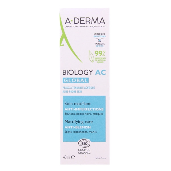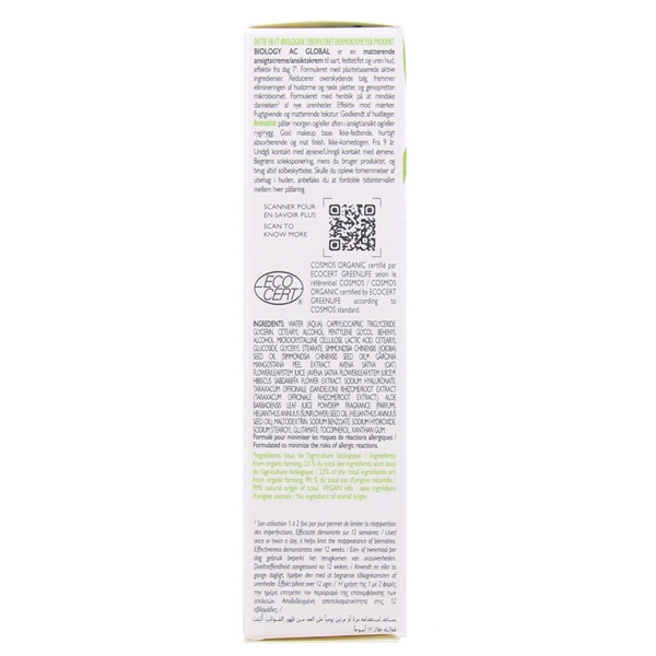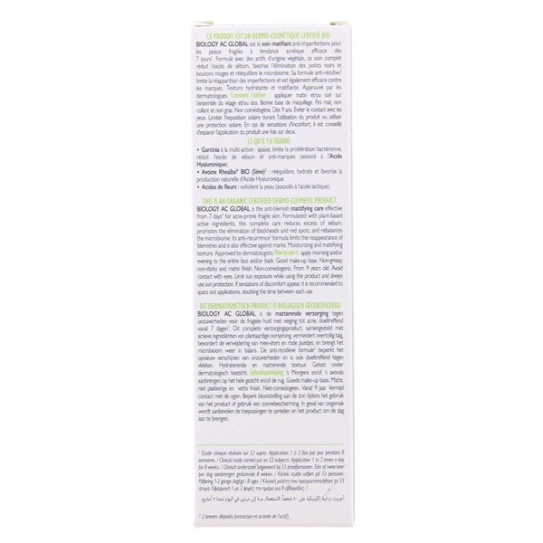 Biology AC Global est un soin matifiant anti-imperfection indiqué pour réduire l'excès de sébum, apaiser et diminuer les rougeurs, exfolier et désincruster les pores. Ce soin estompe les imperfections, favorise l'élimination des points noirs et des boutons, hydrate et matifie durablement, redonne éclat au teint.