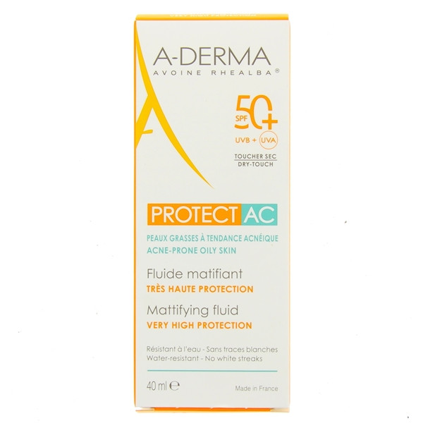 A-Derma Protect AC Fluide Matifiant Très Haute Protection SPF 50+ est un fluide matifiant et également un écran solaire de très haute protection spécialement formulé pour les peaux à tendance acnéique et grasse.