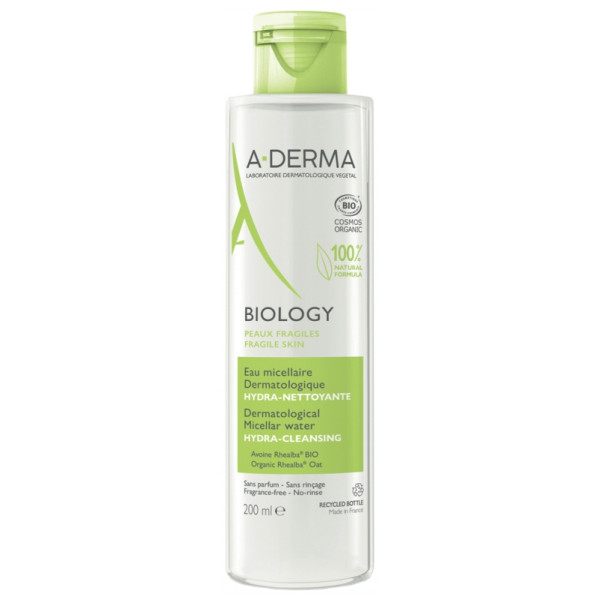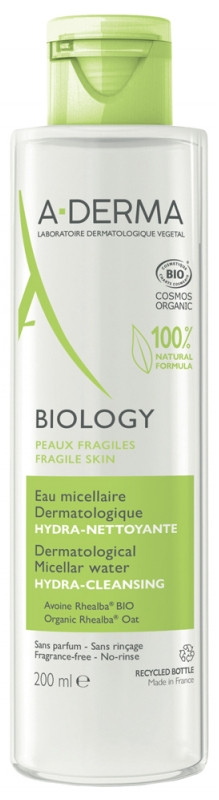 L'Eau Micellaire Dermatologique Hydra-nettoyante de la gamme Biology du laboratoire A-Derma démaquille, nettoie et hydrate en douceur et efficacement les peaux fragiles.