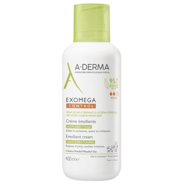 Exomega Control Crème Émolliente Anti-grattage 400 ml A-Derma nourrit la peau en réduisant la sécheresse cutanée et renforce la barrière cutanée grâce à la Filaxérine, à la vitamine B3, et à des ingrédients émollients. De plus, elle aide à rééquilibrer le microbiome cutané pour une peau en meilleure santé. Composée à 95 % d’ingrédients d’origine naturelle, sans parfum, elle convient aux peaux sensibles, même chez les nouveau-nés. L’emballage est éco-conçu, avec 33 % de plastique en moins, et est recyclable.