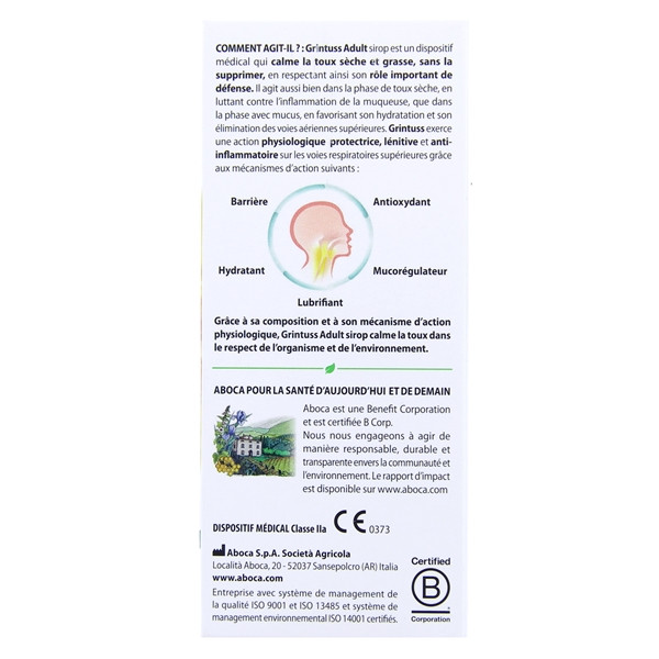 Grintuss Adulte sirop Aboca soulage efficacement la toux chez les adultes et les enfants dès l’âge de 12 ans. Dans sa composition, on retrouve des plantes comme la Grindélia, le plantain, l’hélichryse.