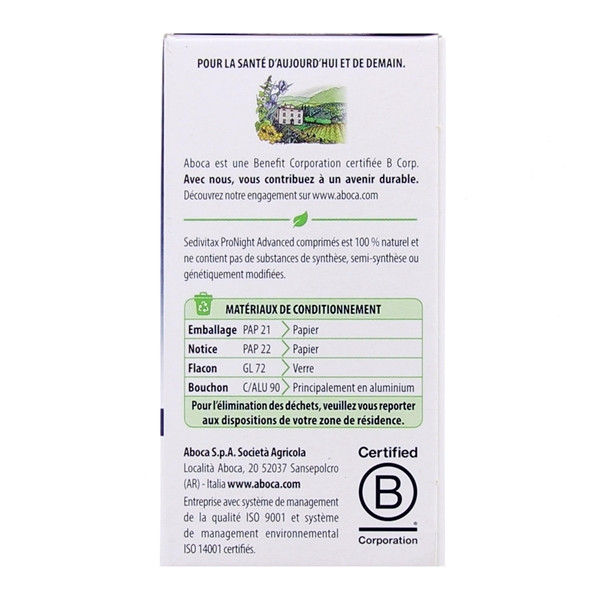 Sedivitax ProNight Advanced est un produit 100 % naturel, né des plateformes scientifiques avancées de la Recherche Aboca, qui ont permis de développer le complexe moléculaire innovant Syncrocell, riche en flavonoïdes et withanolides, composés naturellement présents dans la Passiflore, le Houblon et l’Ashwagandha.