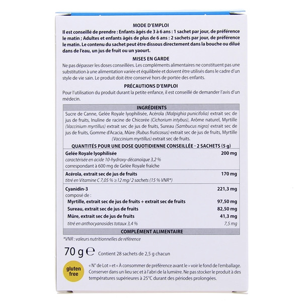 Ingrédients : Sucre de Canne, Gelée Royale lyophilisée, Acérola (Malpighia punicifolia) jus de fruits lyophilisé, Inuline de racine de Chicorée (Cichorium intybus), Arôme naturel, Myrtille (Vaccinium myrtillus) jus de fruits lyophilisé, Sureau (Sambucus nigra) jus de fruits lyophilisé, Gomme Arabique, Mûre (Rubus fruticosus) jus de fruits lyophilisé, Myrtille (Vaccinium myrtillus) extrait sec de fruits.