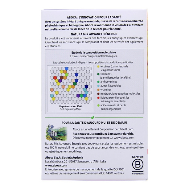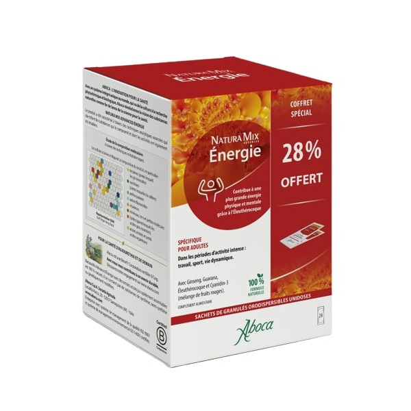 Natura Mix Énergie du laboratoire Aboca est un complément alimentaire pour les adultes qui contribue à une plus grande énergie physique et mentale. Il se prend idéalement lors de périodes d'activité intense : travail, sport, vie dynamique...