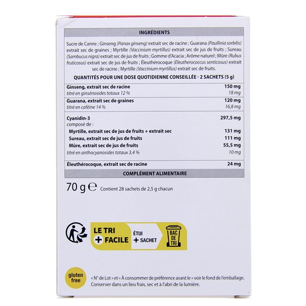 Sucre de Canne ; Ginseng (Panax ginseng) extrait sec de racine ; Guarana (Paullinia sorbilis) extrait sec de graines ; Myrtille (Vaccinium myrtillus) extrait sec de jus de fruits; Sureau (Sambucus nigra) extrait sec de jus de fruits; Gomme d’Acacia ; Arôme naturel ; Mûre (Rubus fruticosus) extrait sec de jus de fruits; Éleuthérocoque (Eleutherococcus senticosus) extrait sec de racine ; Myrtille (Vaccinium myrtillus) extrait sec de fruits.