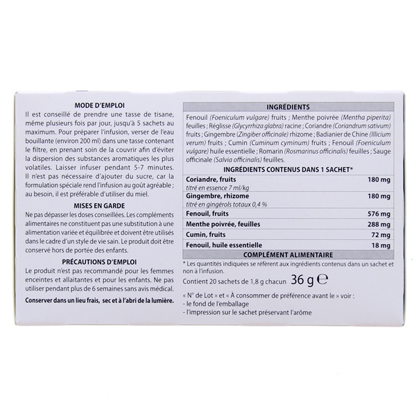 Fenouil (Foeniculum vulgare) fruits ; Menthe poivrée (Mentha piperita) feuilles ; Réglisse (Glycyrrhiza glabra) racine ; Coriandre (Coriandrum sativum) fruits ; Gingembre (Zingiber officinale) rhizome ; Badianier de Chine (Illicium verum) fruits ; Cumin (Cuminum cyminum) fruits ; Fenouil (Foeniculum vulgare) huile essentielle ; Romarin (Rosmarinus officinalis) feuilles ; Sauge officinale (Salvia officinalis) feuilles.