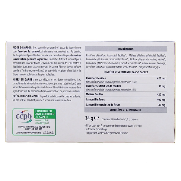 Passiflore (Passiflora incarnata) feuilles, Mélisse (Melissa officinalis) feuilles, Camomille (Matricaria chamomilla) fleurs, Réglisse (Glycyrrhiza glabra) racine, Camomille (Matricaria chamomilla) extrait sec de fleurs, arôme naturel d’orange, Passiflore (Passiflora incarnata) extrait sec de feuilles.