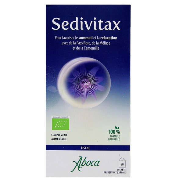 Sedivitax Tisane sachets Aboca est une tisane destinée à favoriser le sommeil le soir et la relaxation pendant la journée. Il est formulé avec 3 extraits de plantes : passiflore, mélisse et camomille. Il s’agit d’un produit idéal pour obtenir facilement le sommeil même en cas de stress, notamment grâce à la présence de la passiflore dans sa composition. Il peut également être pris en journée afin de favoriser la relaxation, de par l’action en synergie de ses 3 ingrédients : passiflore, mélisse et camomille.