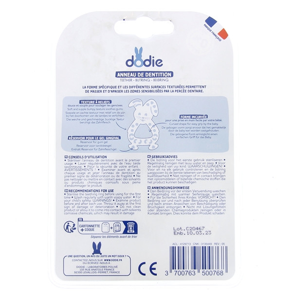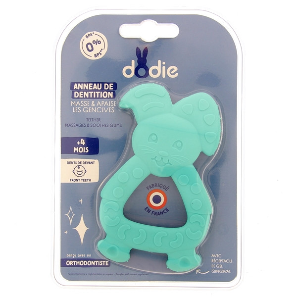 L'anneau de dentition Dodie est destiné aux bébés de 4 mois et plus pour masser et apaiser leurs gencives lors des percées dentaires.