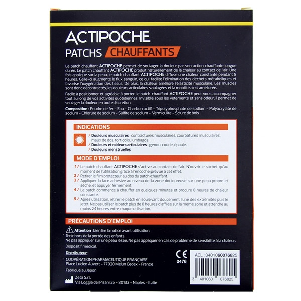 Le patch chauffant Actipoche permet de soulager la douleur par son action chauffante longue durée. Les agents thermoactifs contenus dans le patch chauffants Actipoche produisent naturellement de la chaleur au contact de l'air. Une fois appliqué sur la peau, le patch chauffant Actipoche diffuse une chaleur constante pendant 8 heures.