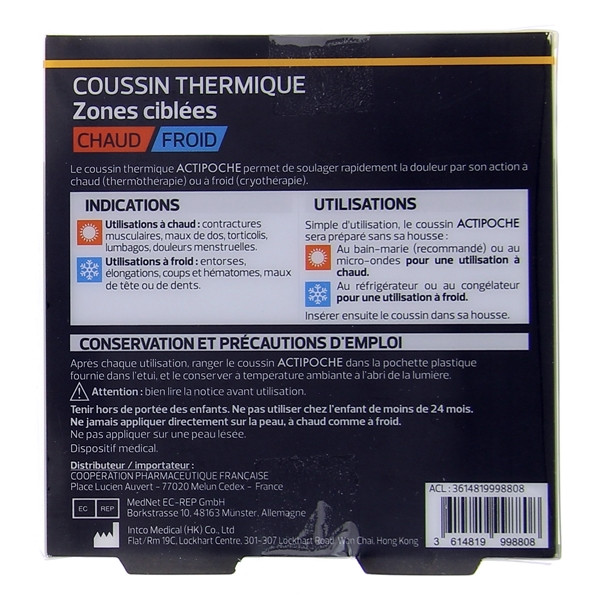Disponible en boîte de 1 coussin thermique 10 x 20 cm avec sa housse de protection.