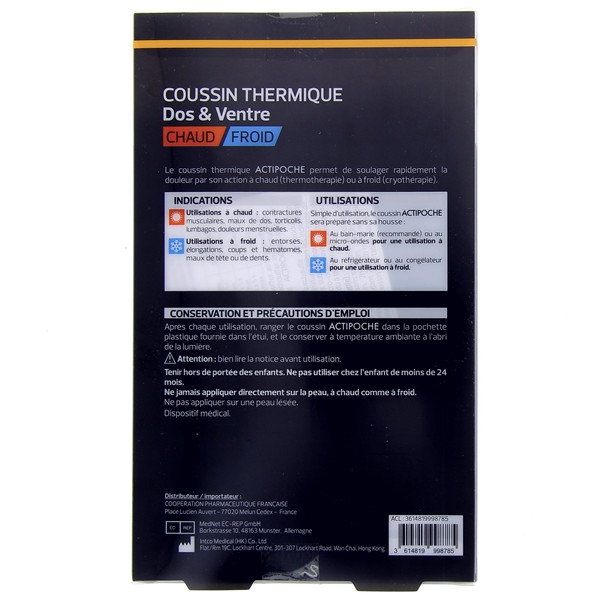 Disponible en boîte de 1 coussin thermique 20 x 30 cm avec sa housse de protection.