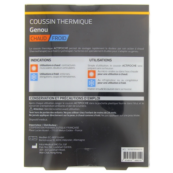 Disponible en boîte de 1 coussin thermique 20 x 30 cm avec sa housse de protection.