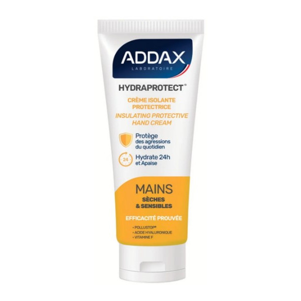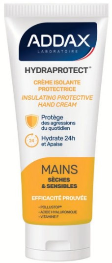 Hydraprotect® Crème Mains Isolante Protectrice du laboratoire Addax est destinée aux mains sèches et sensibles. Ce soin offre une hydratation pendant 48 heures, apaise rapidement et protège la peau des agressions du quotidien afin de retrouver rapidement un confort cutané.