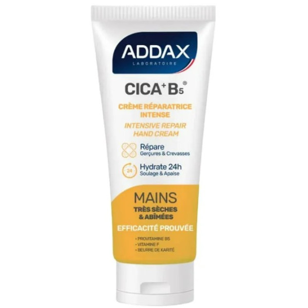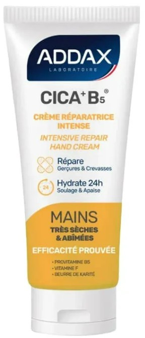 Cica+B5® Crème Mains Réparatrice Intense du laboratoire Addax est destinée aux mains très sèches et abîmées. Ce soin répare dès 5 jours les gerçures et crevasses, offre une hydratation longue durée (48 h), apaise efficacement et restaure rapidement la barrière cutané.