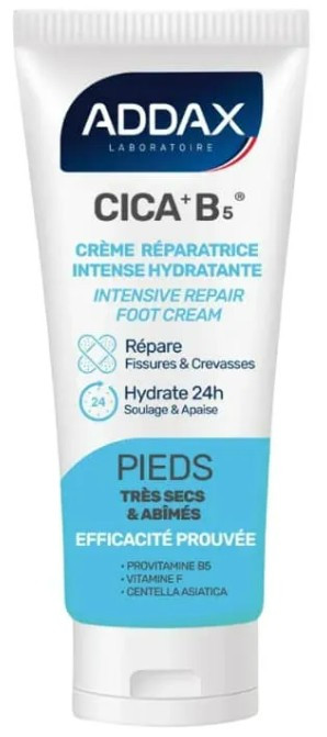 Cica+B5® Crème Pieds Réparatrice Intense Hydratante du laboratoire Addax est destinée aux pieds très secs et abîmés. Ce soin répare dès 3 jours les gerçures et crevasses, offre une hydratation pendant 48 h, soulage efficacement et restaure rapidement la barrière cutané.