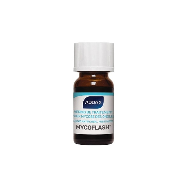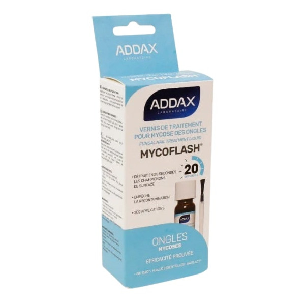Mycoflash® Vernis de Traitement Pour Mycose des Ongles du laboratoire Addax assure l'élimination des champignons de surface en 20 secondes et empêche la recontamination durablement. Ce soin convient aux ongles des mains et des pieds.