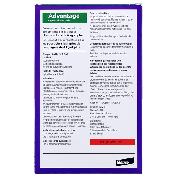 Solution pour dépôt cutanée antipuce à base d'IMIDACLOPRIDE, à action curative et préventive, de couleur jaune clair à légèrement brunâtre. Les puces sont tuées un jour après le traitement. Un seul traitement prévient les ré-infestations par les puces pendant 3 à 4 semaines chez les chats et jusqu'à une semaine chez les lapins. Le médicament peut être intégré dans un programme thérapeutique de la Dermatite Allergique par Piqûres de Puces (DAPP) chez les chats, après diagnostic par un vétérinaire.