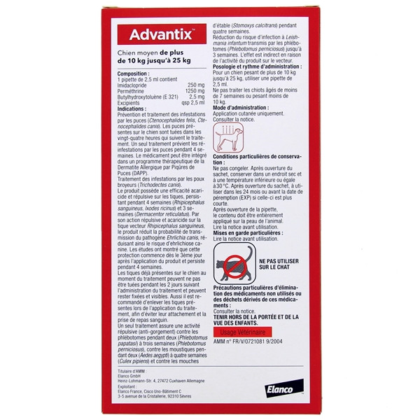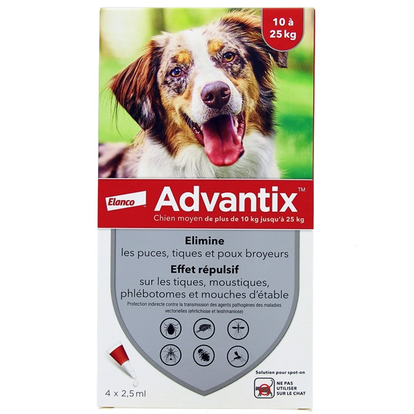 Advantix Chien Moyen est un antiparasitaire externe indiqué chez les chiens de 10 à 25 kg (+ de 7 semaines). Il prévient des infestations et élimine les puces, les tiques et les poux broyeurs.