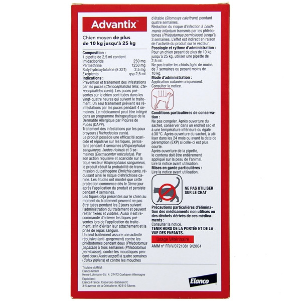 Advantix Chien Moyen est efficace pour éliminer les puces présentes sur le chien dans les 24 heures suivant le traitement. Avec une seule opération, ce produit peut prévenir les ré-infestations par les puces pendant 4 semaines. Celui-ci peut également être intégré dans un programme thérapeutique de la DAPP ou Dermatite Allergique par Piqûre de Puces.
