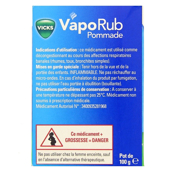 Vicks Vaporub est un médicament sous forme de pommade à utiliser en application cutanée ou en inhalation. Vicks Vaporub est indiqué comme décongestionnant lors des affections respiratoires banales comme le rhume, la toux ou la bronchite simple.