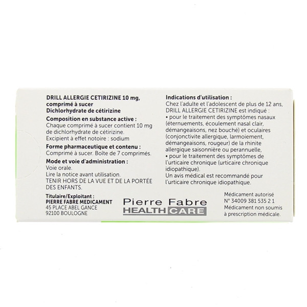 Drill Allergie est un médicament à base de cétirizine pour traiter les symptômes nasaux et oculaires de la rhinite allergique saisonnière ou perannuelle. Il peut également s'utiliser pour traiter les symptômes de l'urticaire chronique.