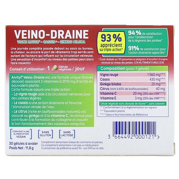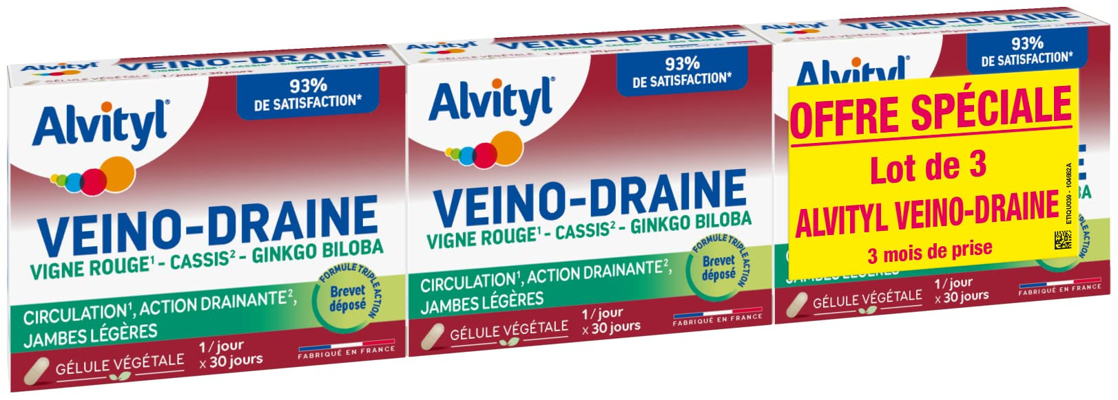 Le complément alimentaire Veino-Draine d'Alvityl possède une formule brevetée triple action pour soulager les jambes lourdes. Veino-Draine aide à drainer, contribue à la circulation veineuse et assure le bon fonctionnement des vaisseaux sanguins.