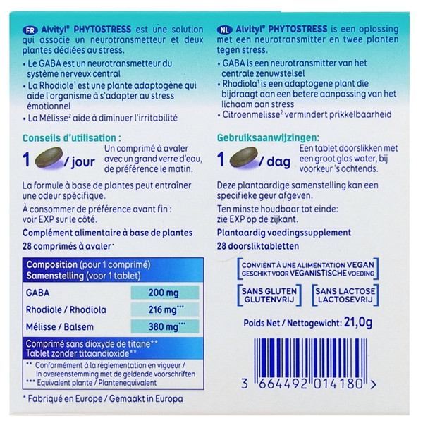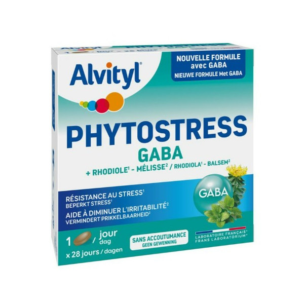 Phytostress Gaba d'Alvityl est un complément alimentaire à base de GABA (un neurotransmetteur), de Rhodiole et de Mélisse pour lutter contre le stress et aider à diminuer l'irritabilité.