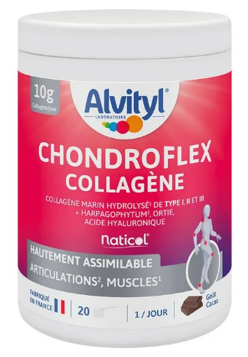 ChondroFlex Collagène du laboratoire Alvityl est un complément alimentaire en poudre au goût cacao, riche en collagène marin, harpagophytum, ortie et acide hyaluronique. Il aide à maintenir la souplesse et le confort des articulations, tout en soutenant les cartilages et les tissus conjonctifs.
