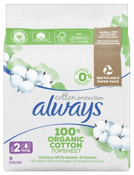 La serviette hygiénique Always Cotton Protection Long Bio est composée d’un voile en coton. Son cœur est fait de cellulose absorbante et de perles de gel ultra absorbant. Le film extérieur est fabriqué à partir de matériaux synthétiques, tandis que l’emballage est en papier recyclable.