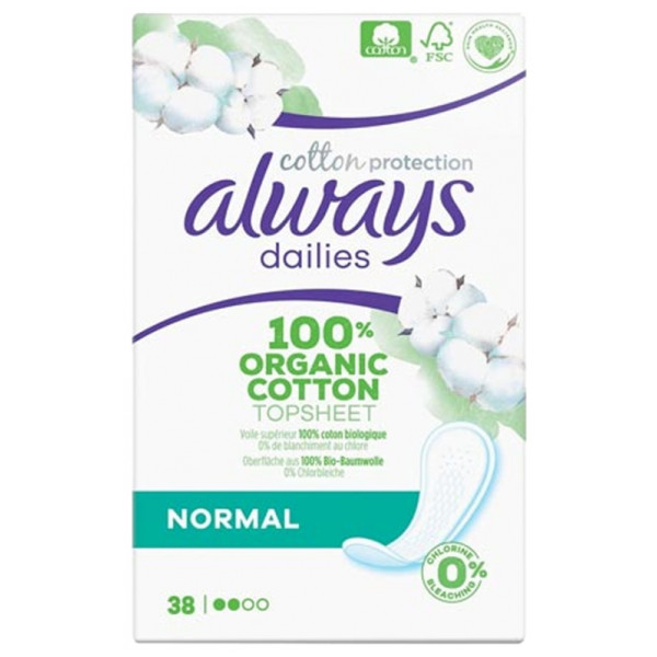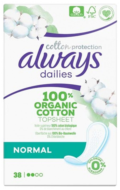 Les Protège-slips Always Daily Cotton Protection Normal sont composés d’un cœur flexible en cellulose absorbante. Ils intègrent des perles de gel absorbant. Le voile supérieur est en coton biologique.