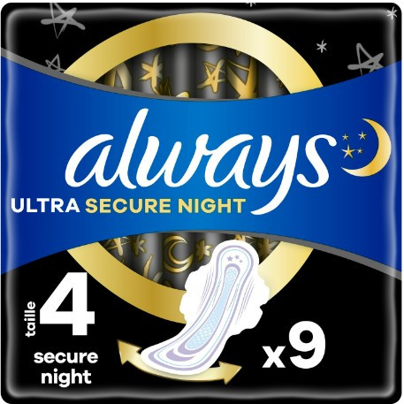 Offrant jusqu’à 10 heures de protection, les serviettes Ultra Secure Night avec ailettes taille 4 sont plus larges que la taille normale. Elles sont également dotées de 3 types de technologies afin d’offrir un bon confort et une discrétion optimale. La partie arrière de la serviette qui s’élargit jusqu’à 60 % est combinée à un système antifuite permettant de retenir efficacement le liquide pendant la nuit. La technologie InstantAbsorb a pour fonction d’absorber le liquide afin de laisser une peau sèche et douce. Grâce au procédé OdourLock, aucune fuite d’odeur n’est possible. Il assure une sensation de propreté et de fraîcheur.