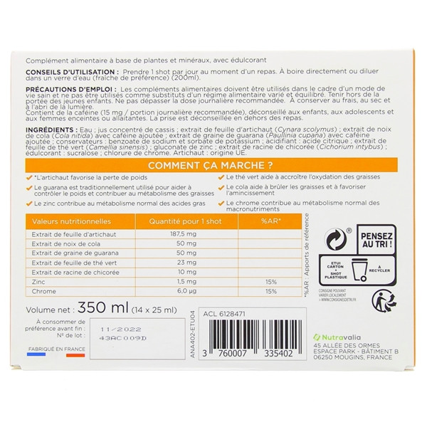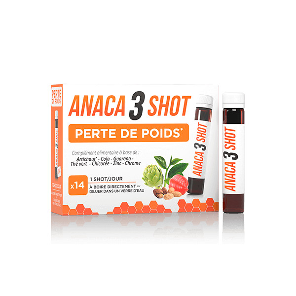 Fabriqué en France, Anaca3 Shot Perte de poids se présente sous la forme de solution buvable, conditionnée en boîte de 14 shots prêts à être utilisé.