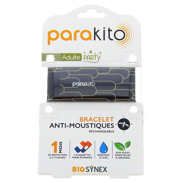 Le Bracelet anti-moustiques Adulte Party PARA'KITO est rechargeable et comporte 2 plaquettes de fabrication française. Il s’agit de dispositifs imprégnés d’huiles essentielles de géraniol qui ne rentrent pas en contact avec la peau. Résistant à l’eau, ce bracelet n’a pas besoin d’être enlevé lors de baignades.