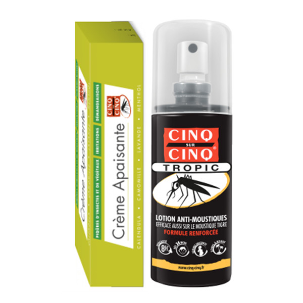 Découvrez l'offre Cinq sur Cinq spéciale moustique contenant la lotion anti-moustiques Tropic en spray de 75 ml + la crème apaisante après-piqûres en tube de 40 g. Ce kit dispose de deux indispensables pour protéger sa peau contre les piqûres de moustiques.