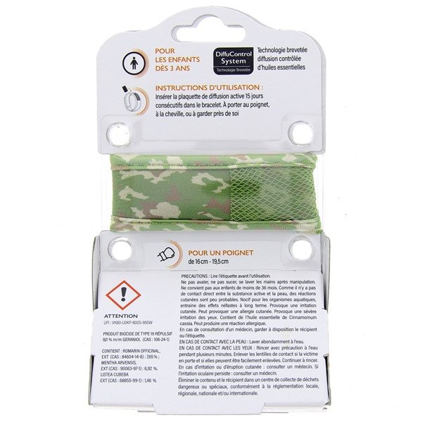 - Bien que n’étant pas en contact direct avec la peau, de légères réactions d'échauffement ou de picotements peuvent apparaître. Celles-ci sont passagères et liées à l'activité du produit. En cas de réaction, retirer immédiatement le bracelet.