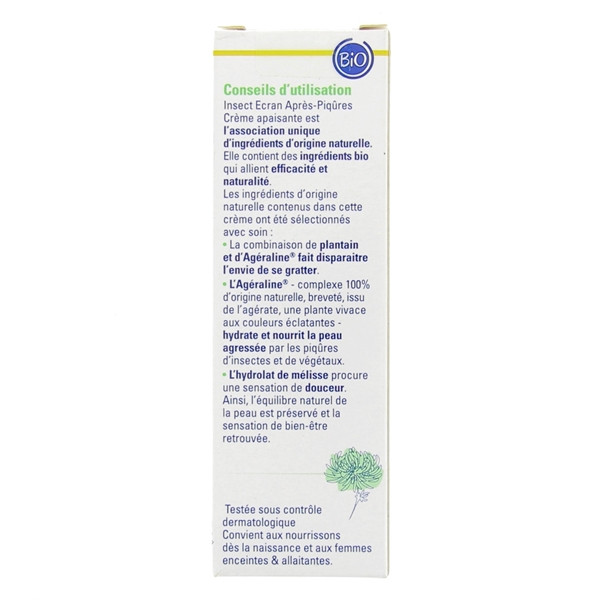 La crème apaisante après-piqûres Bio Insect Ecran, testée dermatologiquement, se compose d'ingrédients d'origine naturelle afin d'être adaptée à tous les types de peau et à tout âge (dès la naissance, femmes enceintes et allaitantes).