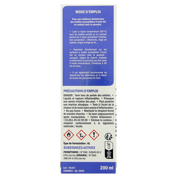 Substances actives: Perméthrine/n°CAS : 52645-53-1 (4 %) (m/m), Géraniol/n°CAS : 106-24-1 (4 %) (m/m).
