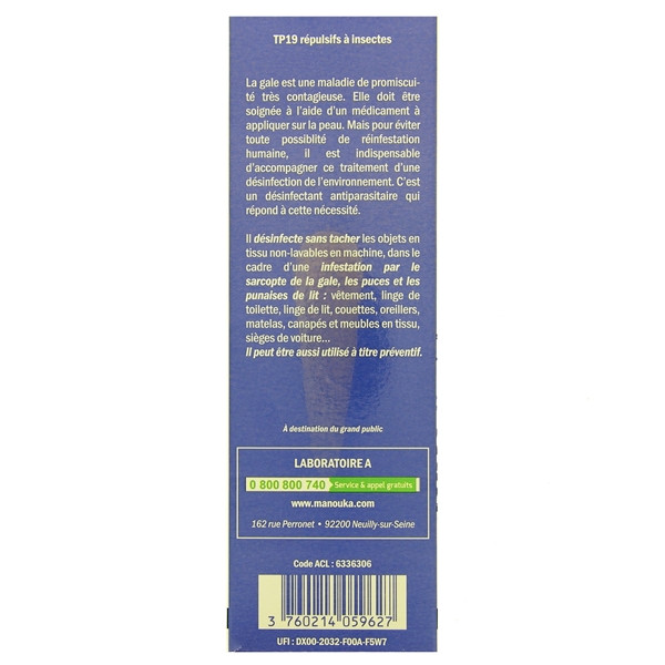 - Spray aérosol à utiliser pour désinfecter des textiles infectés par des parasites.