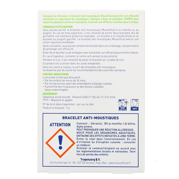 Vous pouvez porter le bracelet Moustifluid à la cheville ou au poignet. En cas de forte exposition, il est conseillé de porter deux bracelets afin de permettre une meilleure protection (exemple : un bracelet à la cheville droite et un bracelet au poignet gauche).