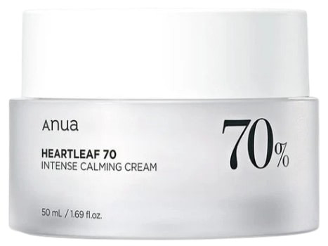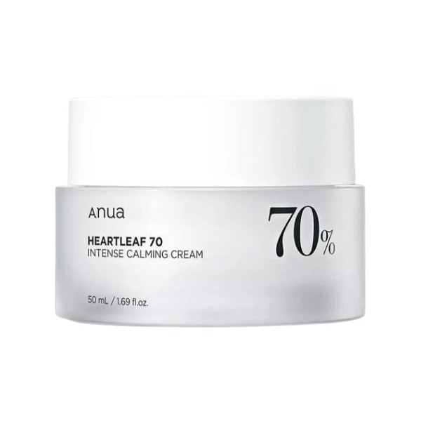 Heartleaf 70 % Intense Calming Cream de la marque coréenne Anua est une crème apaisante formulée avec de la céramide et du panthénol pour aider à maintenir la barrière d'hydratation de la peau et apaiser les irritations.