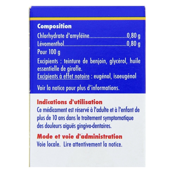 Dentobaume est un médicament sans ordonnance qui ne doit pas être utilisé chez l'enfant de moins de 10 ans. Dentobaume, grâce à son effet anesthésiant, soulage les douleurs dentaires. La consultation d'un dentiste est indispensable si les douleurs dentaires sont persistantes ou trop intenses.