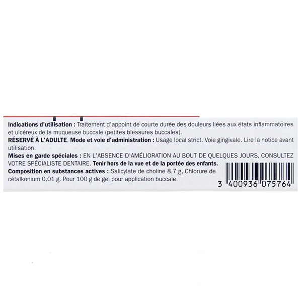Ce gel buccal contient un antalgique (salicylate de choline) et un antiseptique (chlorure de cétalkonium).