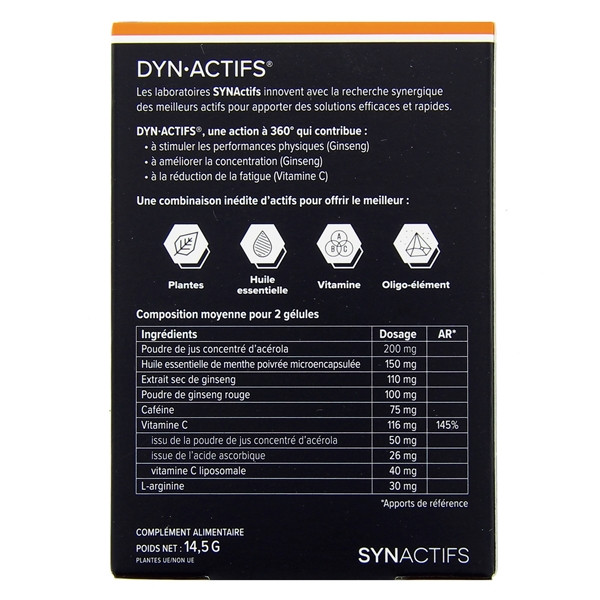 Synactifs DynActifs des laboratoires Aragan est un complément alimentaire à base de plantes, d'oligo-éléments, de vitamine C, d'huile essentielle de menthe poivrée. Il est indiqué pour stimuler les performances physiques, améliorer la concentration et réduire la fatigue.