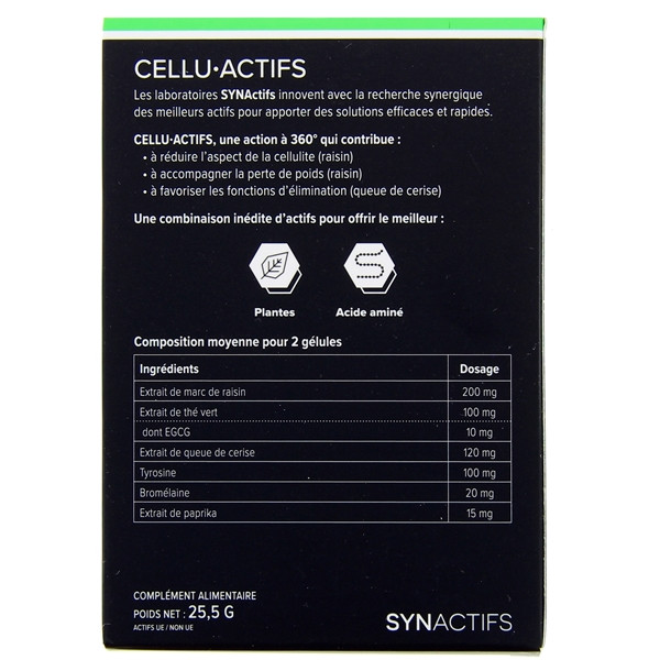 Synactifs CelluActifs des laboratoires Aragan est un complément alimentaire à base de plantes et d'acides aminés pour contribuer à réduire l'aspect de la cellulite, accompagner la perte de poids et favoriser les fonctions d'élimination.