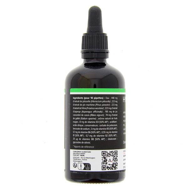 Aragan HydroActifs Synactifs contient des extraits de feuilles de frêne. Cette plante connue pour ses vertus diurétiques contribue à l’évacuation des toxines et de l’excédent d’eau retenus par le corps. Ce produit renferme aussi de l’extrait de piloselle, un végétal réputé pour ses actions drainantes qui activent l’expulsion des substances nocives. À ces deux principaux ingrédients s’ajoute de l’extrait d’écorce de pin maritime qui apporte ses propriétés veinotoniques qui stimulent la circulation sanguine. Ce composant possède, en outre, des vertus antioxydantes et anti-inflammatoires. La formule est complétée par du gaillet grateron qui exerce des effets sur le drainage lymphatique et des vitamines B1, B2, B3, B6, B8 qui soutiennent le métabolisme énergétique. Ce produit à l’arôme naturel de fruits rouges est disponible en flacon avec pipette de 100ml.