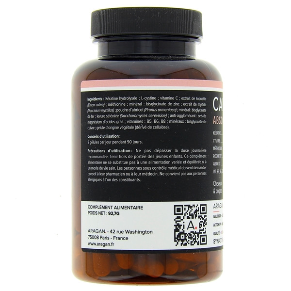 Synactifs CapActifs Absolu des laboratoires Aragan est un complément alimentaire à base de kératine, acides aminés, plantes, vitamines et oligo-éléments pour lutter contre la chute de cheveux, favoriser la croissance, le volume et la vitalité des cheveux et contribuer à la beauté des ongles.