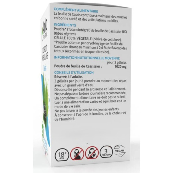 Arkogélules Cassis Bio est un complément alimentaire formulé à base de feuille de cassissier Bio, qui contribue à maintenir la mobilité et la souplesse des articulations et des muscles.