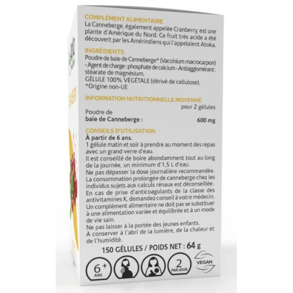 Poudre (Totum intégral) de baie de Canneberge (Vaccinium macrocarpon), Agent de charge : phosphate de calcium, Antiagglomérant : stéarate de magnésium. Gélule 100 % végétale (dérivé de cellulose).