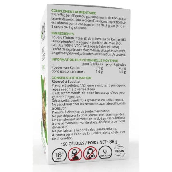 Arkogélules Konjac Bio du laboratoire Arkopharma est conditionné dans une boîte de 150 gélules pour un programme de 16 jours.